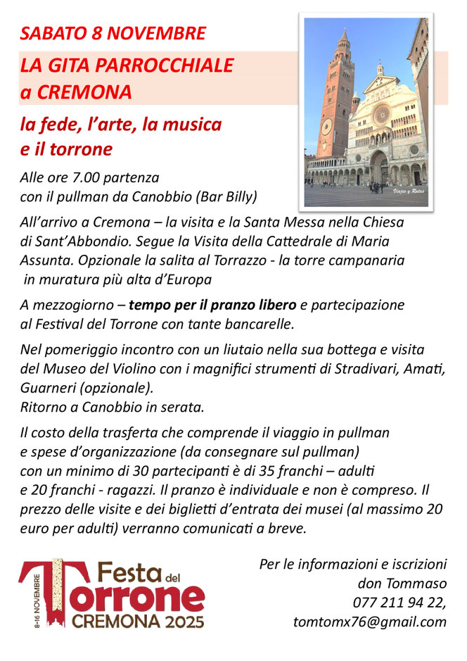 Sabato 8 novembre organizziamo una gita parrocchiale a Cremona, città delle bellissime chiese, della musica e del torrone.